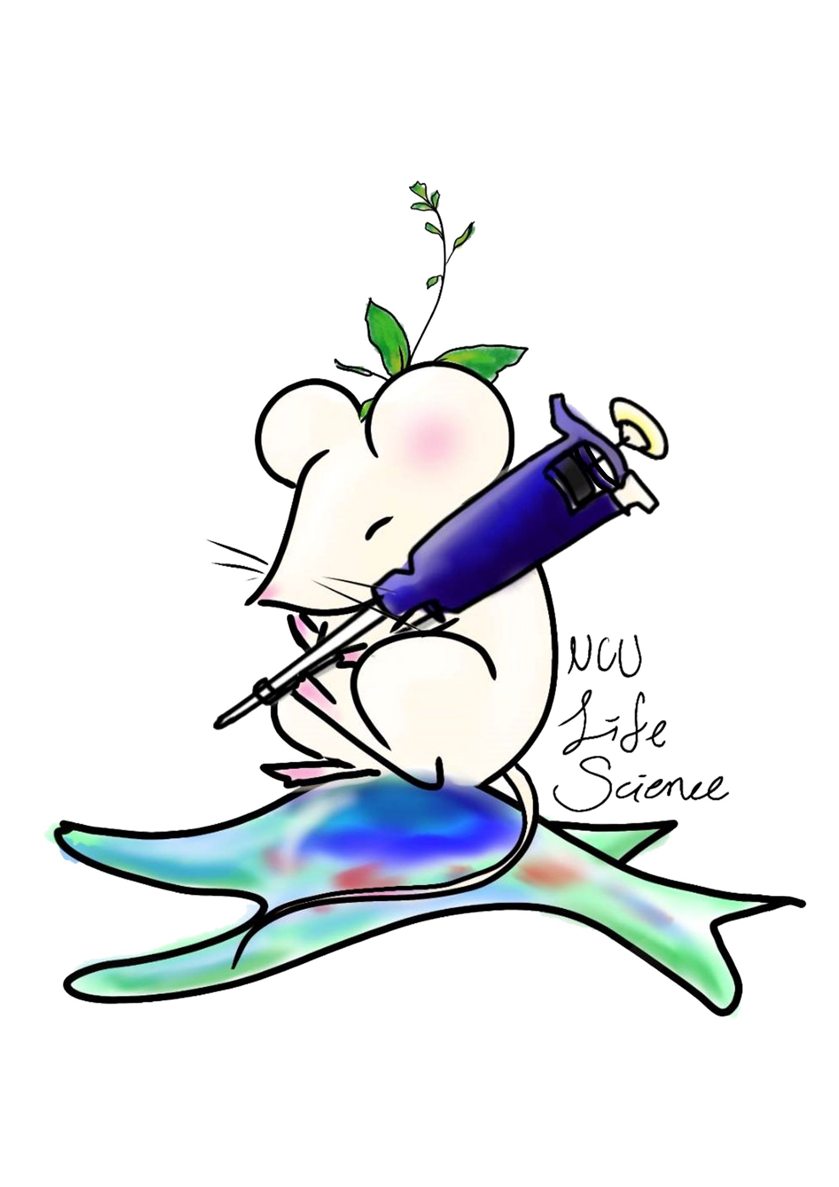設計理念:這張圖由小鼠、細胞、阿拉伯芥與Pipetment四個元素所組成,意在表示生科系的實驗日常,也可以讓人在看到這張圖的時候直觀的聯想到生命科學系。