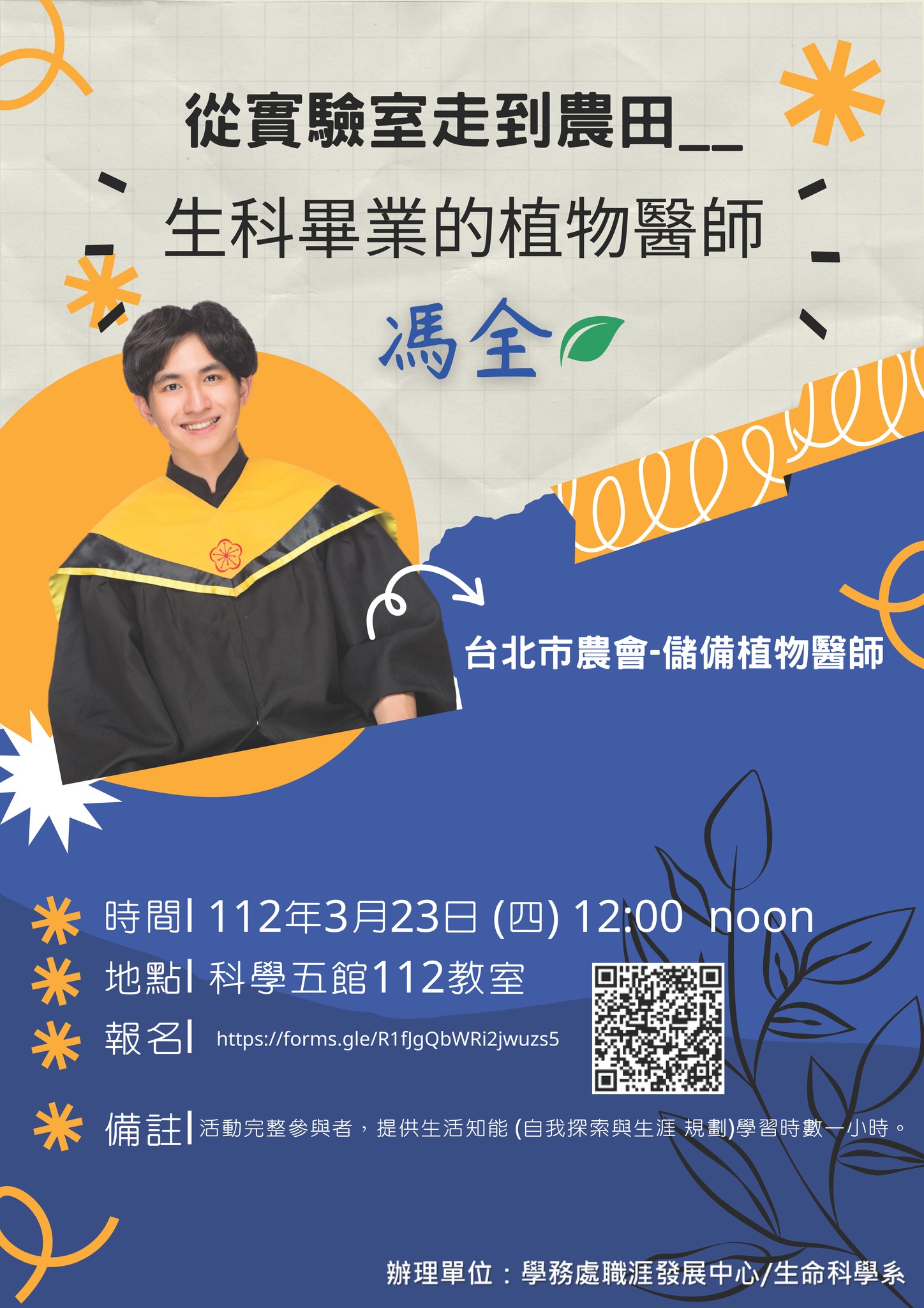 系友專區 上一則 下一則 2023.03.23大學部102級馮全系友演講(現職台北市農會 植物醫生) 發佈日期: 2026-02-06 最後更新日: 2026-02-06 資料來源: 瀏覽人次:39 BACK