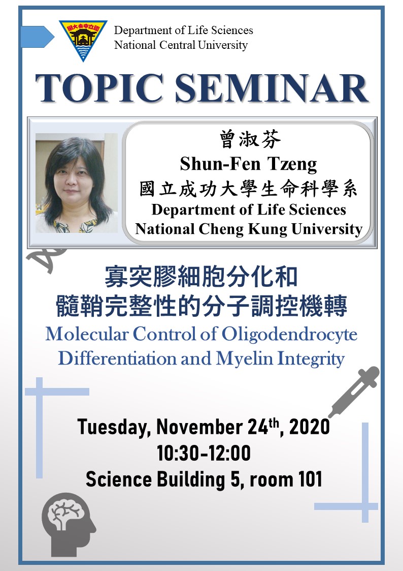演講公告 上一則 下一則 專題演講:成功大學生命科學系 曾淑芬特聘教授 發佈日期: 2020-11-16 最後更新日: 2020-11-25 資料來源: 瀏覽人次:981 2020.11.24 生科系專題演講 演講者:成功大學生命科學系 曾淑芬特聘教授 演講題目:寡突膠細胞分化和髓鞘完整性的分子調控機轉 時間:10:30-12:00 地點:科學五館101演講廳 相簿 109.11.24專題演講海報 109.11.24專題演講 109.11.24專題演講 BACK