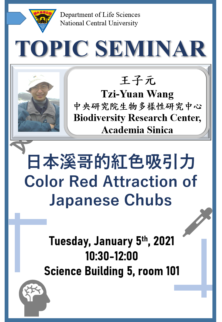演講公告 上一則 下一則 專題演講:中央研究院生物多樣性研究中心 王子元博士/研究副技師 發佈日期: 2021-01-05 最後更新日: 2021-01-06 資料來源: 瀏覽人次:1423 2021.01.05 生科系專題演講 演講者:中央研究院生物多樣性研究中心 王子元博士/研究副技師 演講題目:日本溪哥的紅色吸引力 Color Red Attraction of Japanese Chubs 時間:10:30-12:00 地點:科學五館101演講廳 相簿 圖片1.png BACK