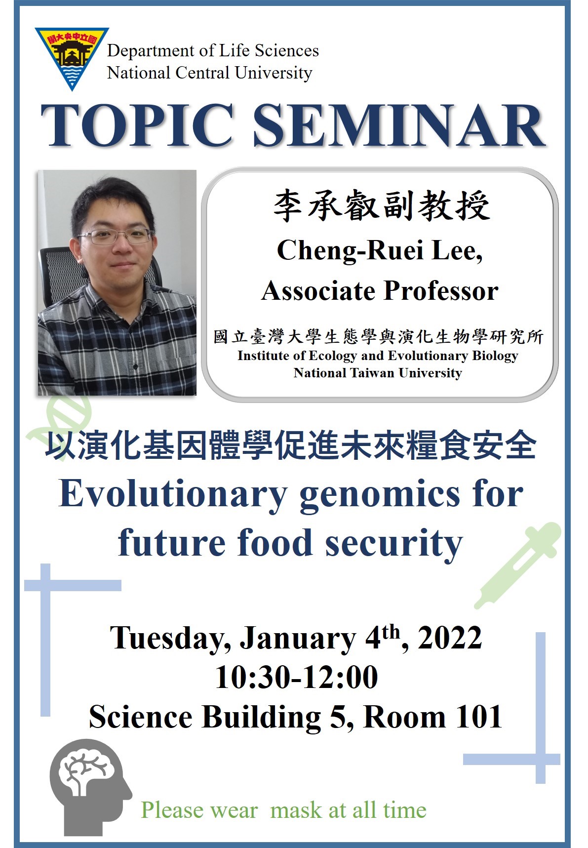 演講公告 上一則 下一則 專題演講:國立臺灣大學生態學與演化生物學研究所 李承叡副教授 發佈日期: 2022-01-03 最後更新日: 2022-01-07 資料來源: 瀏覽人次:820 2022.01.04 生科系專題演講 演講者:國立臺灣大學生態學與演化生物學研究所 李承叡副教授 演講題目:以演化基因體學促進未來糧食安全 Evolutionary genomics for future food security 時間:10:30-12:00 地點:科學五館101演講廳 相簿 0104.jpg BACK