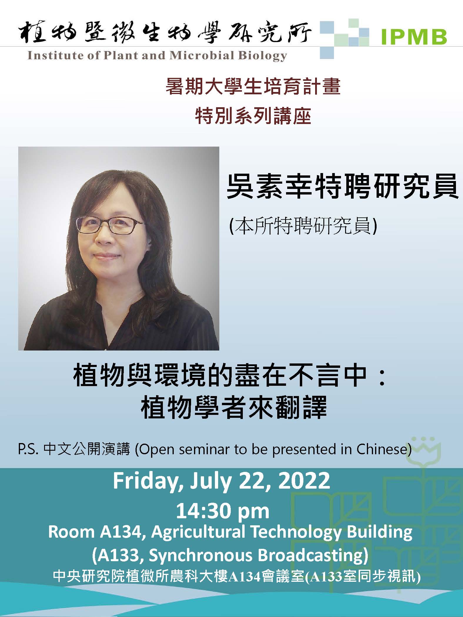 今年中研院植微所暑期大學生的特別系列講座第三場演講將於2022/7/22(週五)下午2:30在中研院植微所農科大樓A134演講廳舉行(A133室同步視訊),本次邀請本所所長吳素幸特聘研究員主講,題目為『植物與環境的盡在不言中:植物學者來翻譯』。