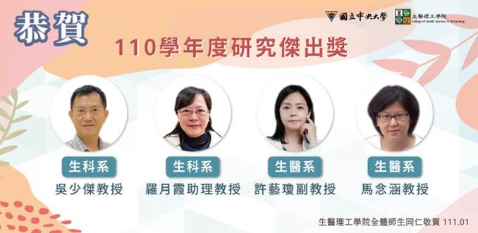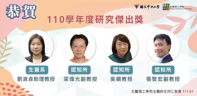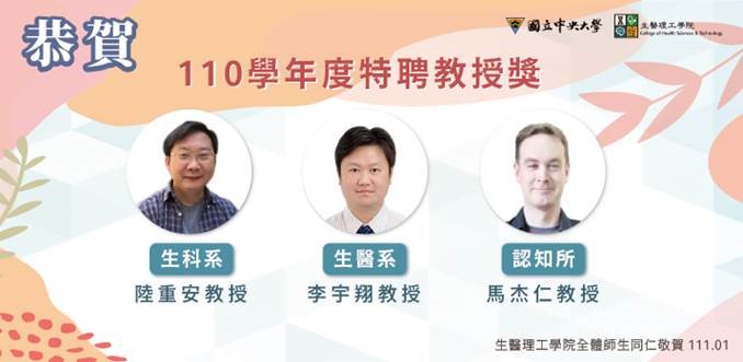 「110學年度特聘教授」~生科系陸重安教授、認知所馬杰仁教授及生醫系李宇翔教授。「110學年度研究傑出獎」~生科系吳少傑教授、羅月霞助理教授、認知所吳嫻教授、張智宏副教授、梁偉光副教授、生醫系馬念涵教授、許藝瓊副教授及劉淑貞助理教授。