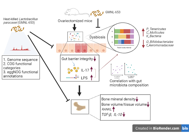 副乾酪乳酸桿菌(Lacticaseibacillus paracasei GMNL653),可以回復骨質疏鬆小鼠模式的腸道菌相失衡,調節免疫反應以及腸道屏障完整性,改善抗骨質密度的效果。