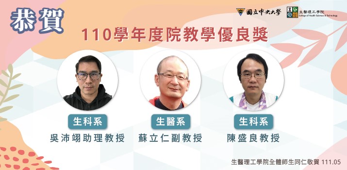 系所公告 上一則 下一則 【恭賀】本系陳盛良教授、吳沛翊助理教授獲獎 發佈日期: 2022-05-16 最後更新日: 2022-05-16 資料來源: 瀏覽人次:616 【恭賀】生醫理工學院教師獲獎喜訊 賀!生科系陳盛良教授、吳沛翊助理教授榮獲 「110學年度院教學優良獎」 ◎生醫理工學院獲獎教師: • 110學年度校務服務優良獎:認知所吳嫻教授 • 110學年度校教學優良獎:生醫系陳健章副教授 • 110學年度院教學優良獎:生醫系蘇立仁副教授 相簿 0516-3.jpg 0516.jpg 0516-2.jpg BACK