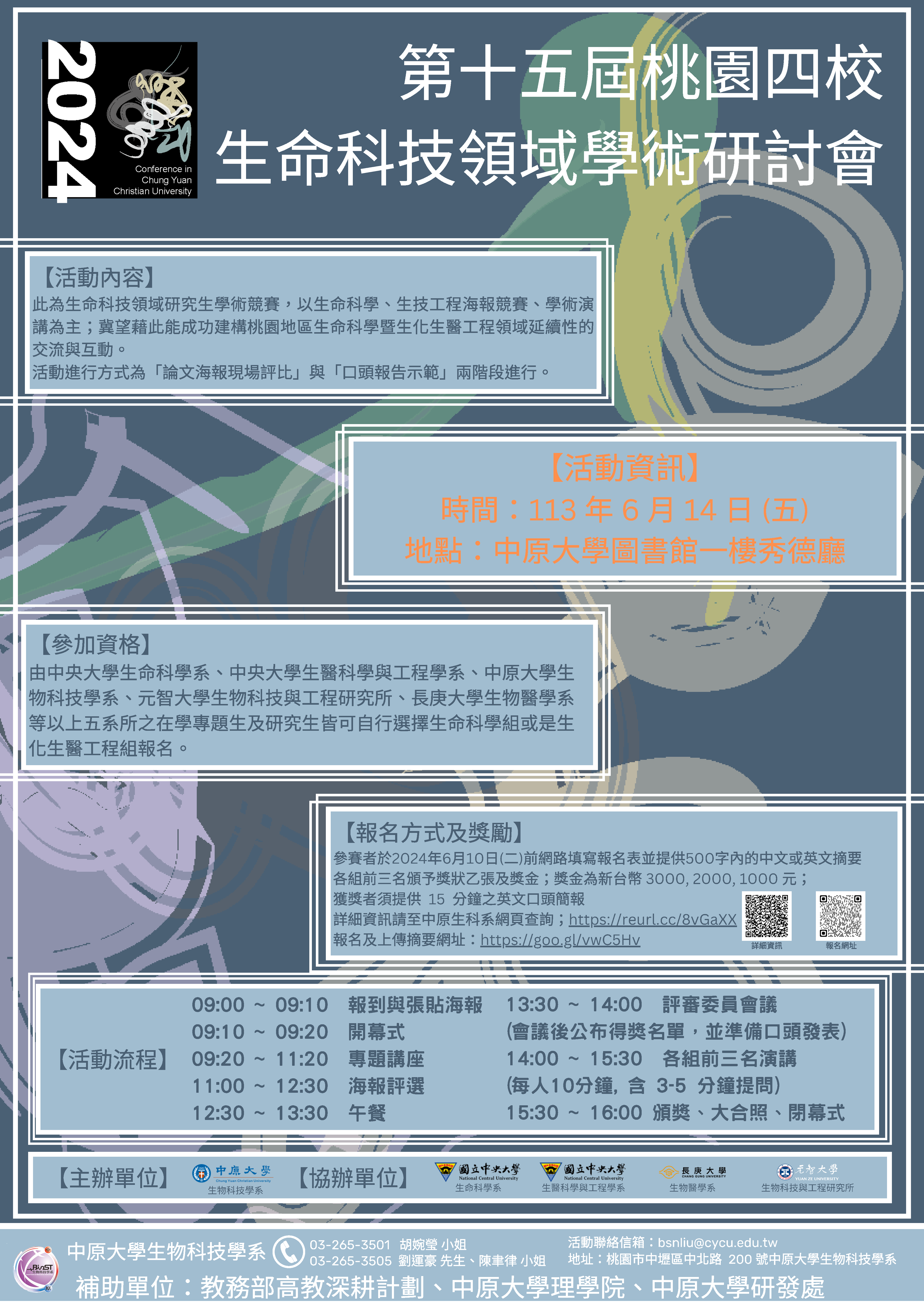 舉辦地點:中原大學張靜愚圖書館 1F 秀德廳 (演講) 及中原大學生物科技館 1 樓 (海報評比場地)