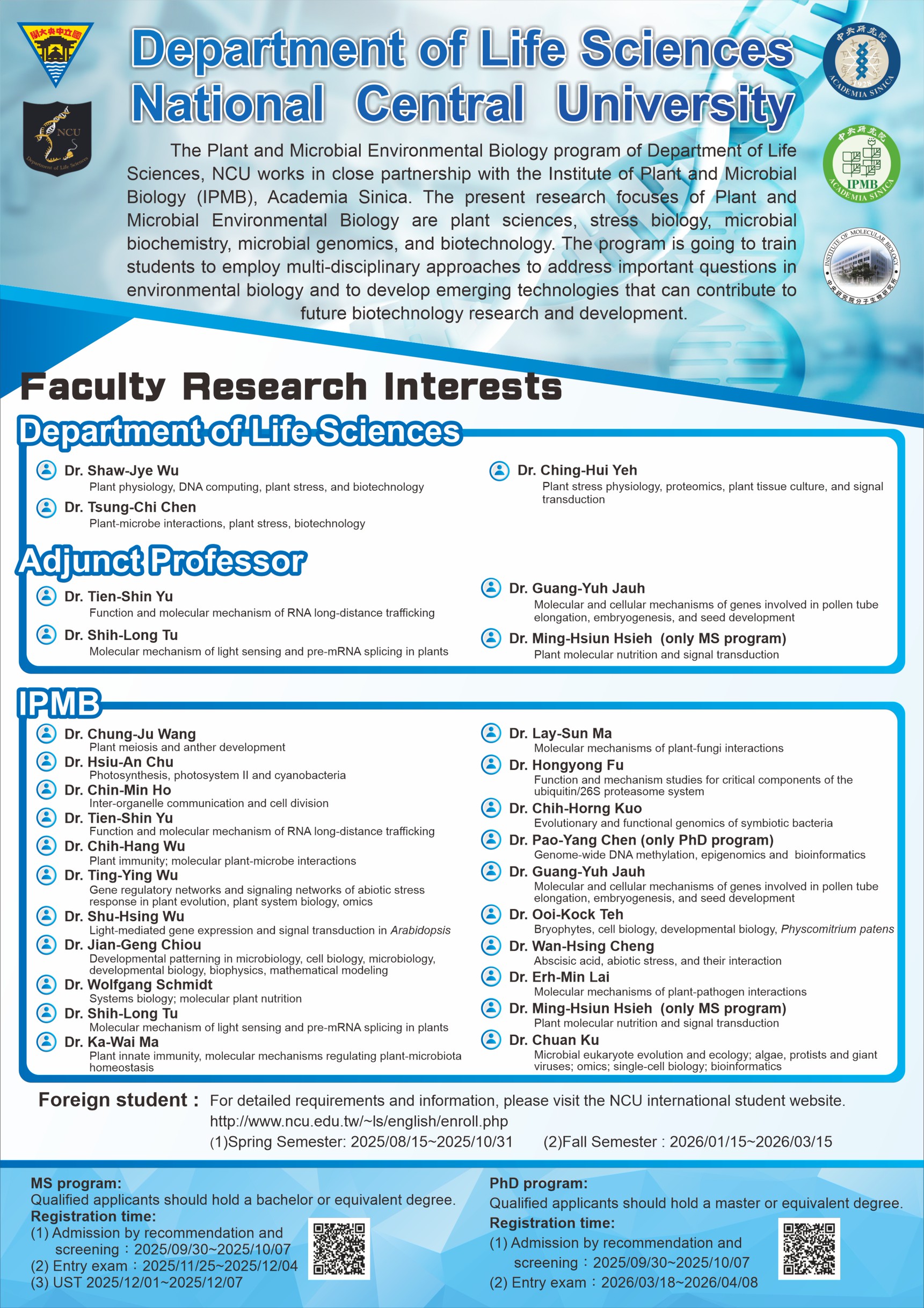 王中茹、朱修安、何金敏、余天心*、吳志航、吳亭穎、吳素幸、邱澗庚、涂世隆*、馬家威、馬麗珊、郭志鴻、陳柏仰(僅博班)、趙光裕*、鄭惠國、鄭萬興、賴爾珉、謝明勳*(僅碩班)、顧銓IPMB-NCU Graduate Program